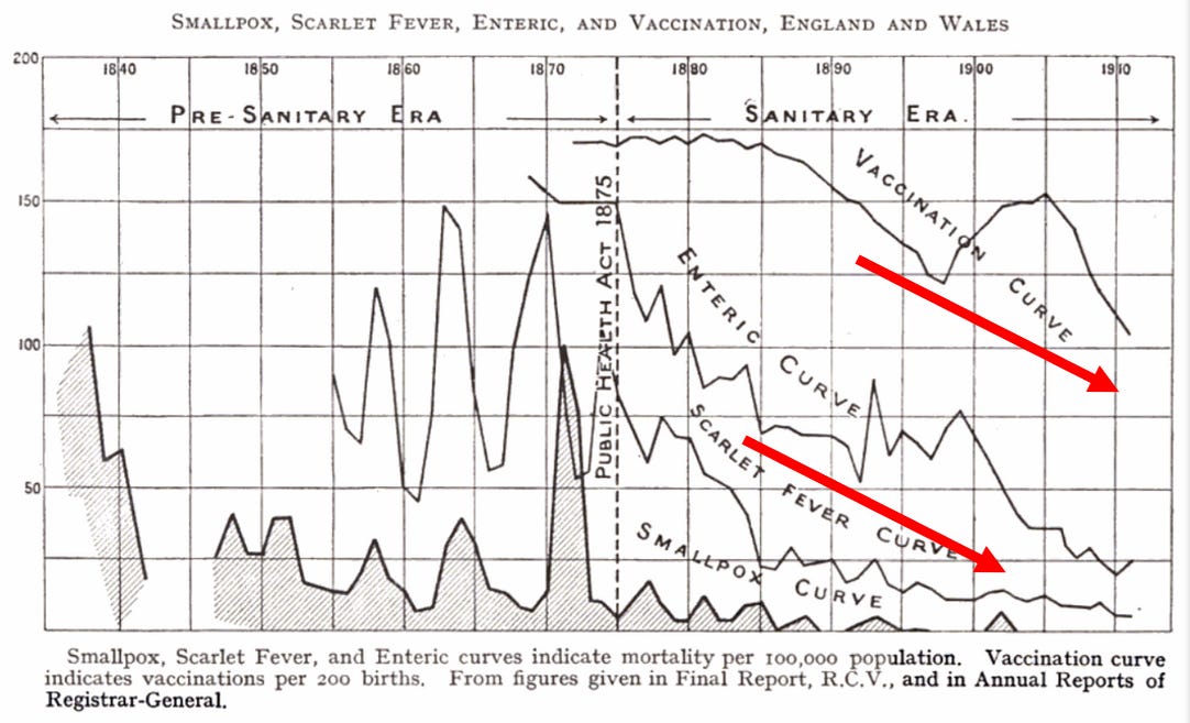 This universal trend is critical for understanding smallpox. As Dr. Millard’s 1914 chart showed, the mortality lines for smallpox and “other zymotic (infectious) diseases” fell in near-perfect parallel from the 1870s onward. This synchronized collapse points overwhelmingly to a common cause—improvements in sanitation, nutrition (especially reduced malnutrition), clean water, less crowded housing, and the abandonment of harmful medical treatments such as bleeding and heavy-metal purges.