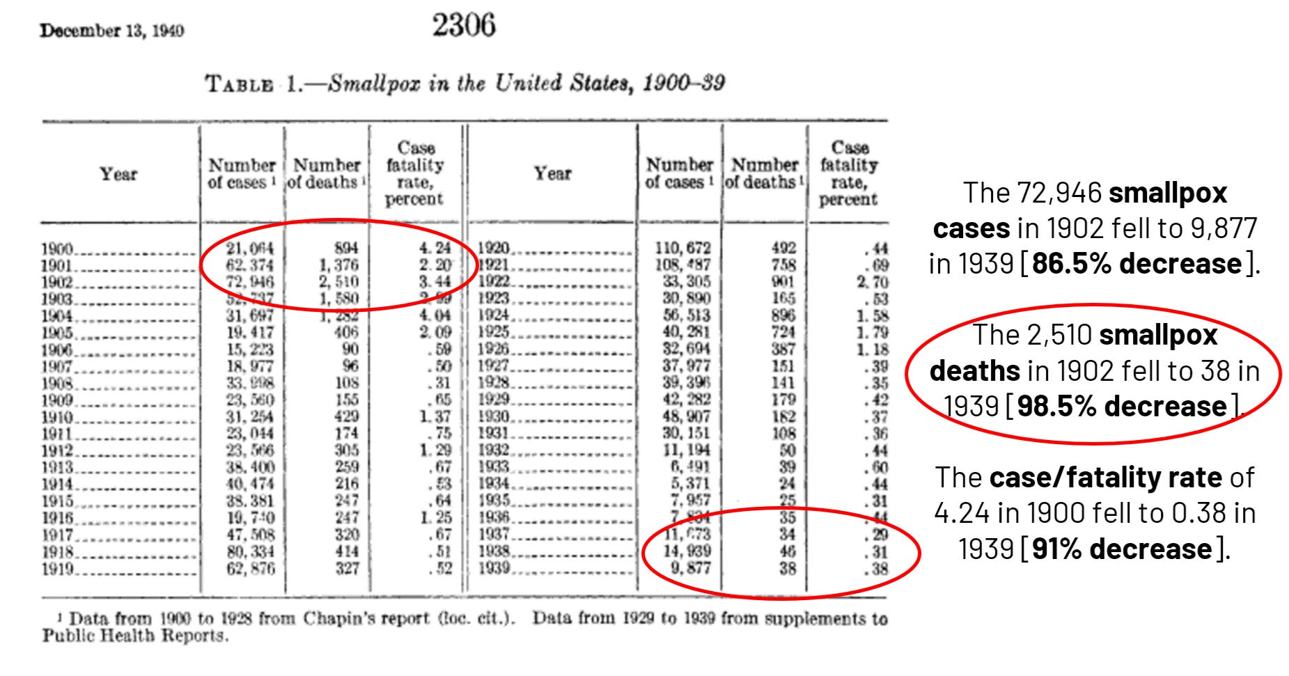 A 1940 article in Public Health Reports showed the ever-downward spiral of smallpox – cases, case/fatality rate, and deaths all plummeted.[30]