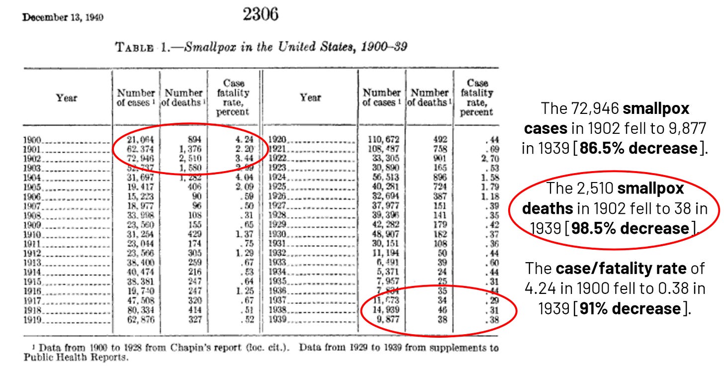 “Smallpox had become a mild illness, with a significant decrease in its fatality rate. The fatality rate of 20.84% in 1895 had dropped to an astonishing 0.26% [98.7% decrease].”[23]