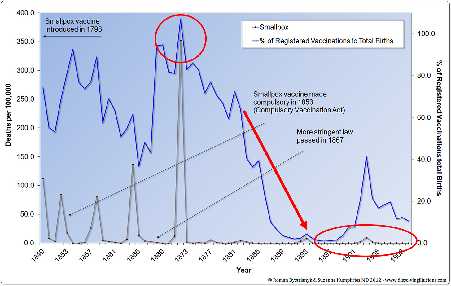“...in Leicester during the 62 years since infant vaccination was abandoned there have been only 53 deaths from smallpox, and in the past 40 years only two deaths. Moreover, the experience in Leicester is confirmed, and strongly confirmed, by that of the whole country. Vaccination has been steadily declining ever since the “conscience clause” was introduced, until now nearly two-thirds of the children born are not vaccinated. Yet smallpox mortality has also declined until now quite negligible. In the fourteen years 1933-1946 there were only 28 deaths in a population of some 40 million, and among those 28 there was not a single death of an infant under 1 year of age.”[32]