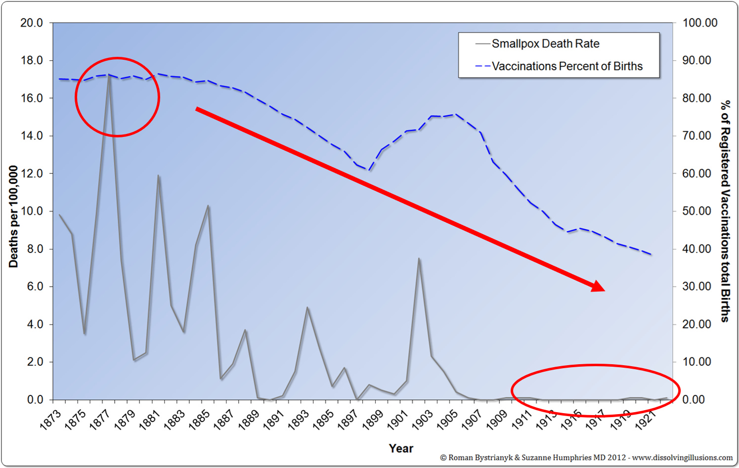 “I am firmly convinced (1), that vaccination never protected against smallpox, and never has been relied upon to do so; (2) that smallpox, like other zymotic diseases, has decreased because of our better sanitary and hygiene conditions and the disinfection and isolation practiced when the disease is present; (3) that vaccination, as practiced now and at all times since its introduction, has caused untold suffering to countless thousands of helpless victims, and that disease, life-long suffering and death have followed in its trail.”[4]